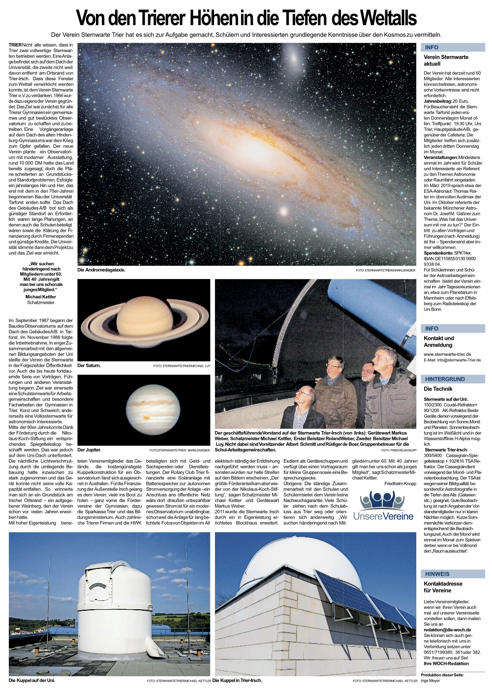 TRIER Nicht alle wissen, dass in Trier zwei vollwertige Sternwarten betrieben werden. Eine Anlage befindet sich auf dem Dach der Universität, die zweite nicht weit davon entfernt am Ortsrand von Trier-Irsch. Dass diese Fenster zum Weltall verwirklicht werden konnte, ist dem Verein Sternwarte Trier e.V. zu verdanken. 1966 wurde dazu eigens der Verein gegründet. Das Ziel war zunächst, für alle Trierer Gymnasien ein gemeinsames und gut bestücktes Observatorium zu schaffen und zu betreiben. Eine Vorgängeranlage auf dem Dach des alten Hindenburg-Gymnasiums war dem Krieg zum Opfer gefallen. Der neue Verein plante ein Observatorium mit moderner Ausstattung, rund 10 000 DM hatte das Land bereits zugesagt, doch die Pläne scheiterten an Grundstücks- und Standortproblemen. Es folgte ein jahrelanges Hin und Her, das erst mit dem in den 70er-Jahren begonnenen Bau der Universität Tarforst enden sollte. Das Dach des Gebäudes A/B bot sich als günstiger Standort an. Erforderlich waren lange Planungen, an denen auch die Schulen beteiligt waren sowie die Klärung der Finanzierung durch Firmenspenden und günstige Kredite. Die Universität stimmte dann dem Projekt zu und das Ziel war erreicht.