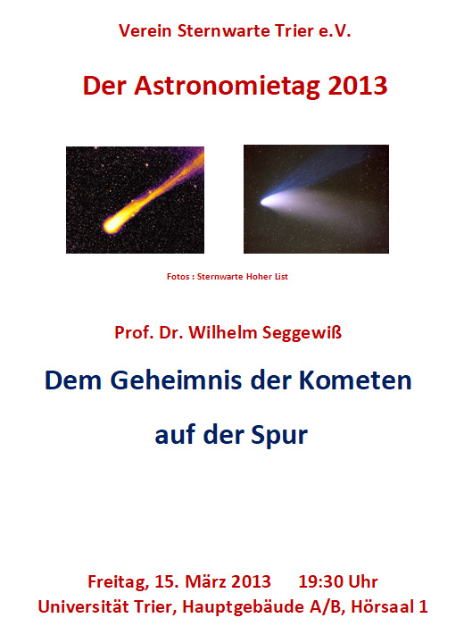 Der Vortrag gewinnt seine aktuelle Bedeutung durch die Tatsache, dass die beiden neu entdeckten Kometen PANSTARRS und ISON im März und November dieses Jahres ungewöhnlich große Helligkeiten erreichen können und uns besondere Schauspiele am Himmel bieten werden.