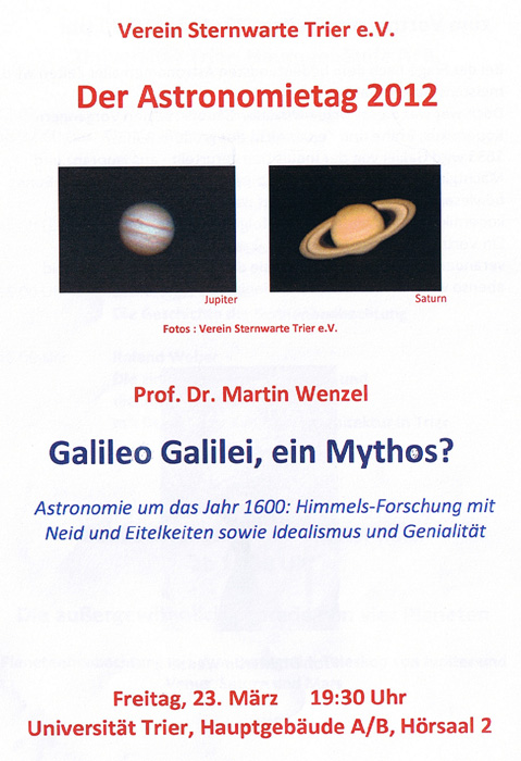 1633 wird Galilei von der Inquisition verurteilt - aus Ignoranz und Machtgier? Der Mythos, er habe die Drehung der Erde um die Sonne bewiesen, kam erst viel später auf. Wer war es dann, der das kopernikanische Weltbild zum Erfolg führte? Ein Vortrag von Astronomen und ihren Schriften, die die Welt veränderten. Getrieben wurden sie dabei von Eitelkeit und Neid ebenso wie von Idealismus und Genialität.