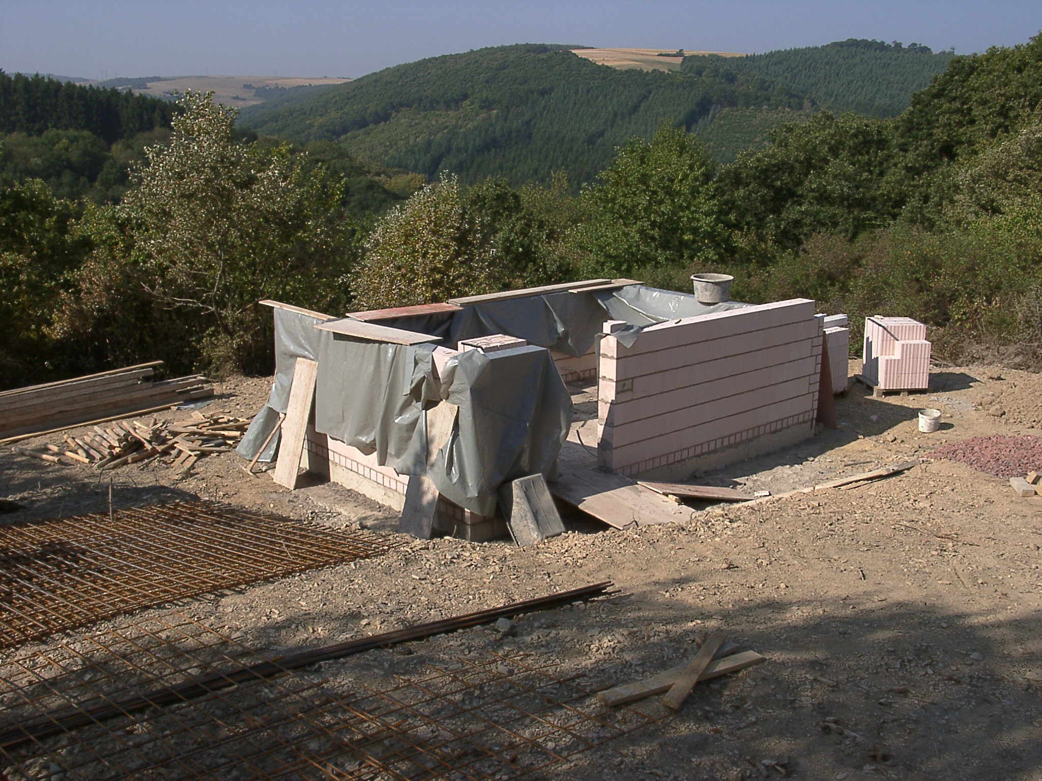 Die Angebote der Bauunternehmer zeigten, dass die schon erwähnte Firma Klein solide und günstig anbot. In der heißen Phase dieses Sommers wurde gebaut. Die Wetterbedingungen waren in Grenzen ein Glücksfall, allerdings nur in Grenzen: Das Grundstück war den ganzen Sommer über auch für Baufahrzeuge leicht erreichbar - ein entscheidender Vorteil. Dagegen mussten der Beton und das Mauerwerk mit Folien vor zu schneller Austrocknung bewahrt werden, was in unserem Klima nicht sehr oft vorkommt.